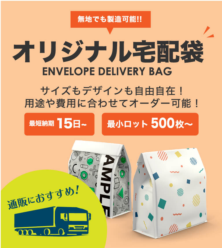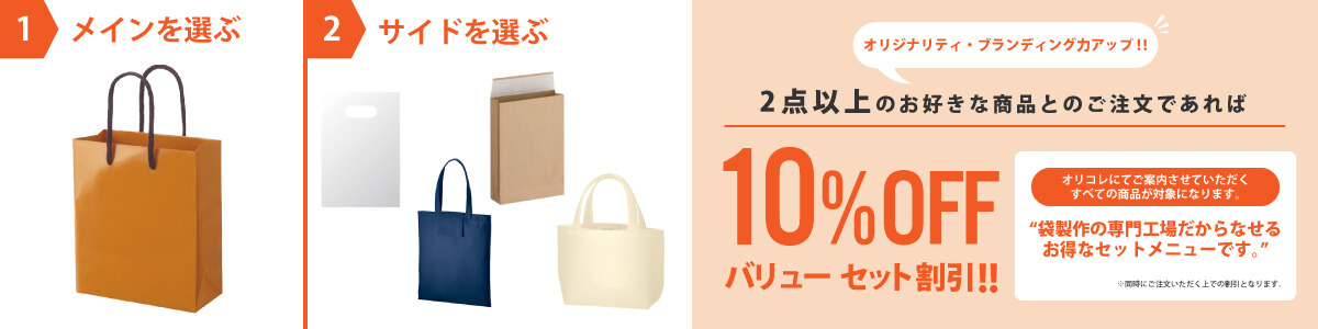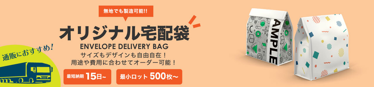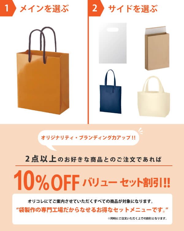 取り扱い商材が豊富なオリコレなら宅配袋と合わせて「紙袋」や「ポリ袋」などその他の商材と合わせてご注⽂いただくことが可能です。統⼀したデザインで製作することによってよりブランドイメージをアップすることが可能となります。