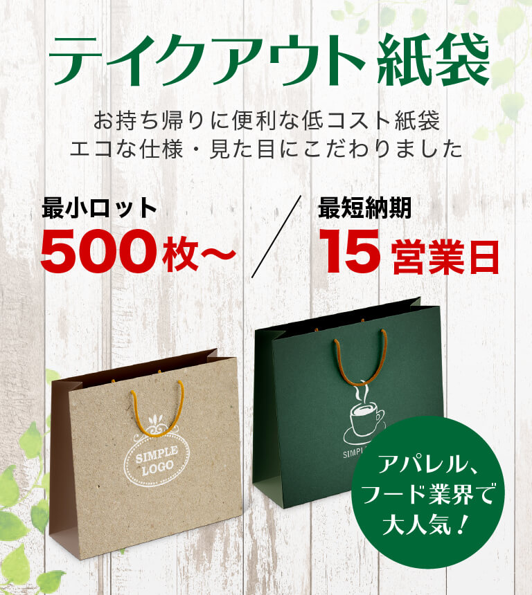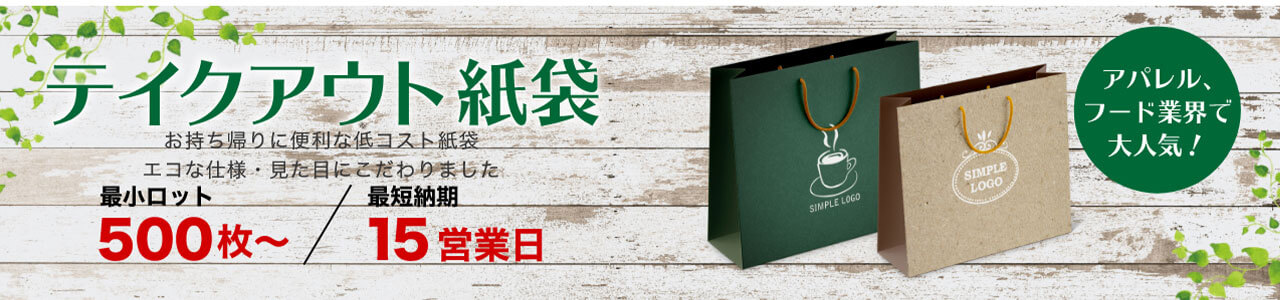 テイクアウト用の紙袋を製作する際のポイントなる素材・加工・サイズ選び・色数・持ち手・こだわりのオプション加工の方法をご紹介します。